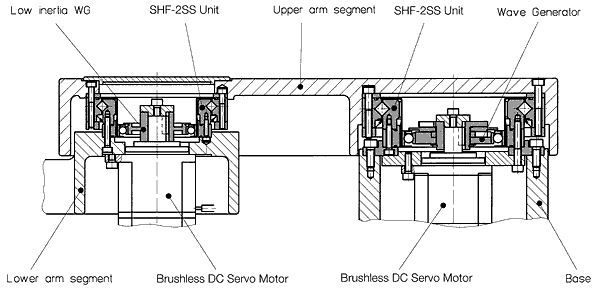 This design example shows how it is possible to reduce this effect by means of a special sealing arrangement. The standard shaft seals, located in the input and output-side flanges, are removed and a hollow sleeve is passed through the unit. One end of the sleeve is fixed to the base housing of the robot, while a V-seal connected to the other end of the sleeve seals the unit against lubricant migration and dirt contamination. The V-seal acts against a thin plate located in the rotating arm of the robot. This plate rotates with the reduced output speed of the gear. The hollow sleeve is used to pass cables and pipes, for sensors and for gripper respectively, through the center of the gear. The sleeve thereby protects the cables from abrasion due to the high-speed rotation of the SHF's hollow-shaft input. The hollow-shaft is driven via a spur gear arrangement.